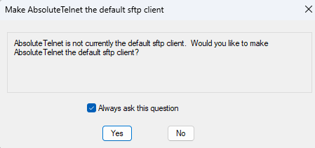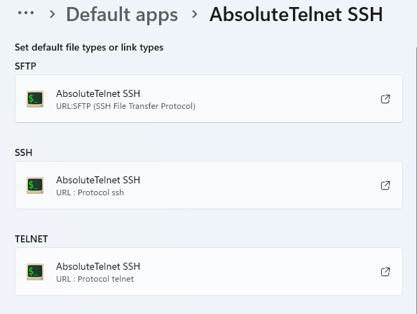 If you have 'make this the default 'x' app set to yes, and it isn't, it will pop the windows default apps dialog so that you can make the change. For security purposes, Windows doesn't allow AbsoluteTelnet/SSH to actually change the default app directly.  But it CAN take you to the right place to do it yourself. Â