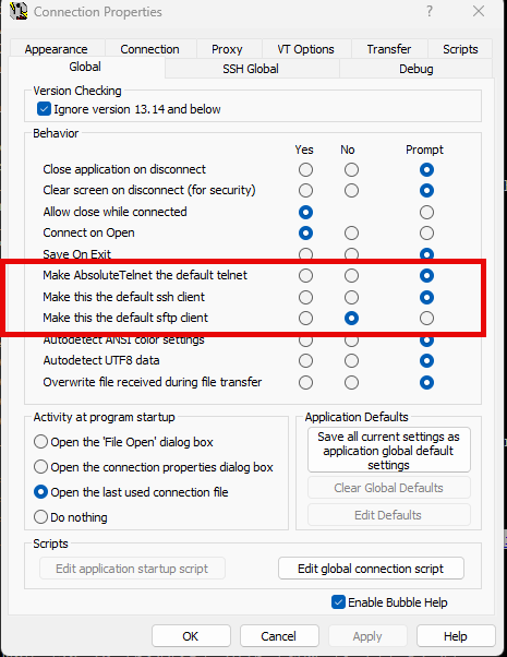 - ... now launching AbsoluteTelnet does not trigger this App Standard setting for SFTP/SSH/Telnet anymore.