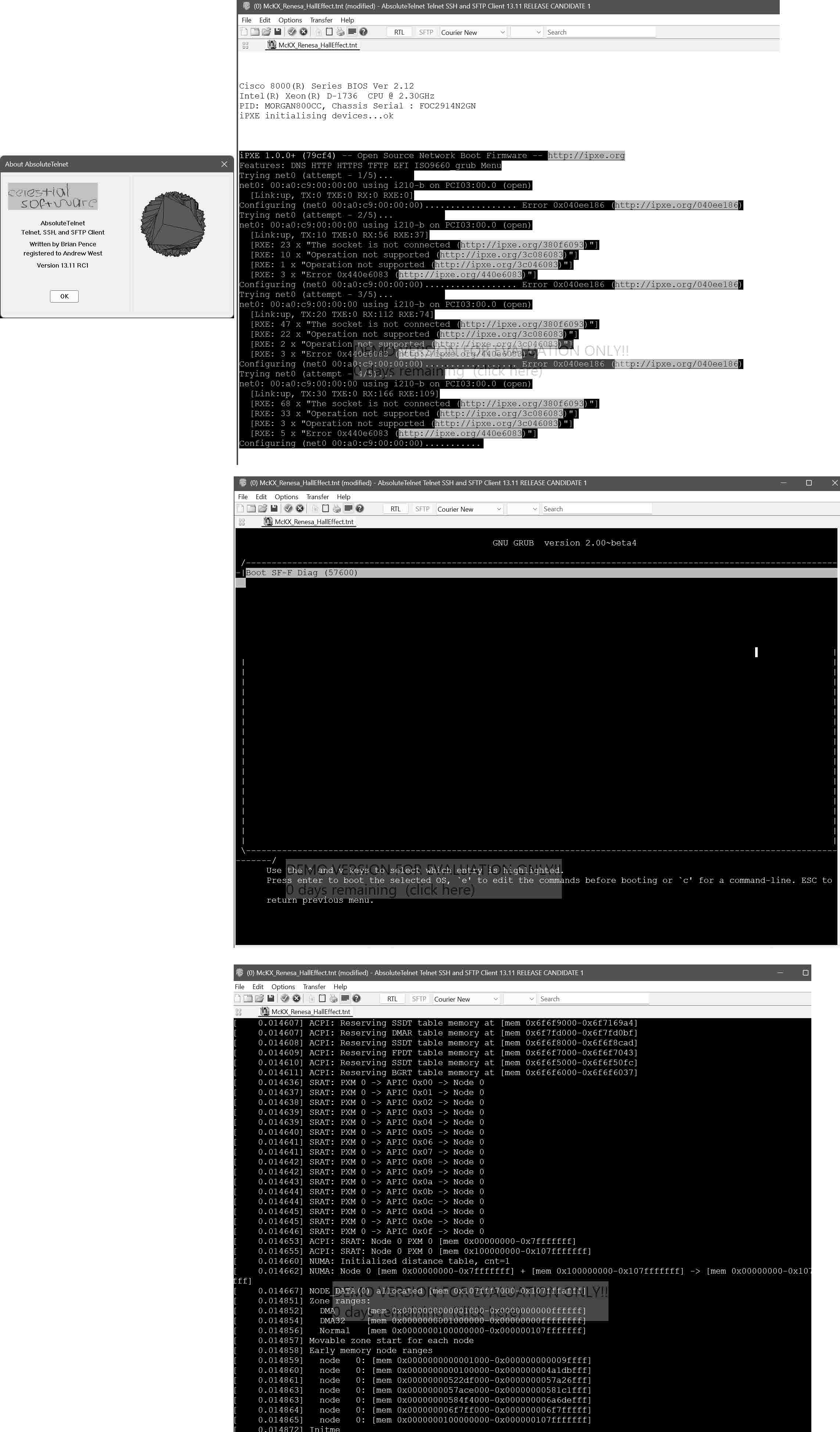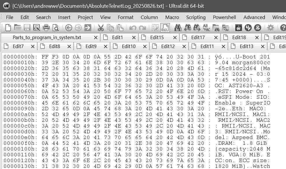 I'll also attach a screenshot of the log -- even thought it's saved as a *.txt file, my editor sees it as a binary-hex file and displays it as shown. I don't know if there are any control-chars etc. in there that would tell you anything. Again, it's got a lot of details that are too proprietary to attach here. If you wanted to look at at during a private Zoom or WebEx session we could do that, as well as letting you live-watch the system boot as the AT screens change (WoB to BoW), we could do that -- nothing beats "seeing for yourself."
